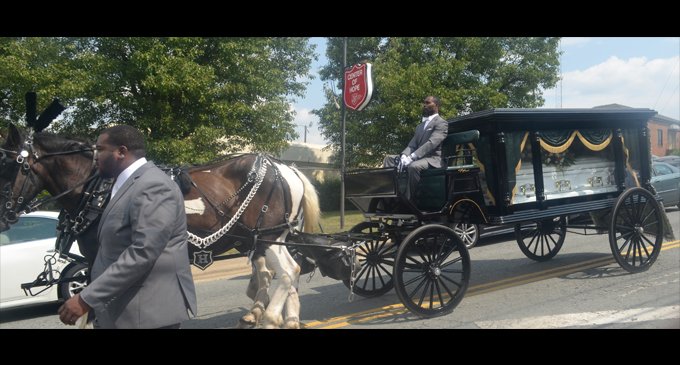 Following the service, hundreds of mourners all dressed in white gathered as Sampson’s family members and friends carried his casket to a horse-drawn carriage. Dozens of people lined the sidewalk along Trade Street taking photos as the carriage made its way down the street.