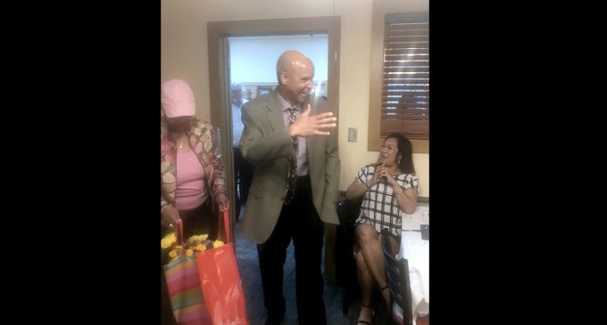 Saddler said it was easy setting up the surprise party for Bryant. A manager helped her get in touch with Bryant’s mother, Elaine, and it took off from there. On Thursday, Aug. 22, the room was filled with family, friends and church members when an unsuspecting Bryant walked in the door. He embraced each person as he walked around the room and then Saddler led him to a table at the front for the festivities to begin.