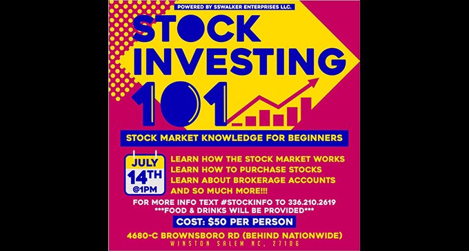 Stock Investing 101 will be held on Sunday, July 14, 1 p.m. at 4680-C Brownsboro Road. Cost for the event is $50 per person. Food and drinks will be provided. For more information, text #STOCKINFO TO 336-210-2619.